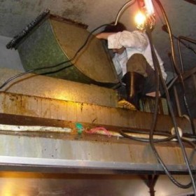 當(dāng)煙道小于40公分見方時(shí),人無法進(jìn)入時(shí)采用此法,技術(shù)人員根據(jù)現(xiàn)場(chǎng)實(shí)際情況,每隔一定距離拆卸一段煙道向兩方延伸清理,此法效果好,難度較大,費(fèi)用較高。