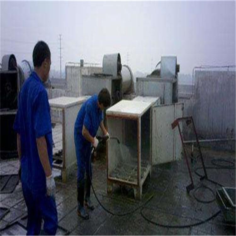 此法主要用于清洗50公分見方以上的豎煙道,技術(shù)人員先拆下管道的上截和下截,在煙道上方固定高空安全繩,系上安全帶,技術(shù)人員從上至下清洗豎煙道內(nèi)的油污。此法危險性較大,技術(shù)性強,費用較高,清理效果好。由于豎煙道一般積油較少一年清洗一次即可。