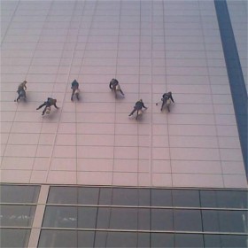2、吊籃方式:在樓頂架設(shè)吊籃將工人運送到指定位置進行施工操作。此施工方式清洗效率較低,成本較高。