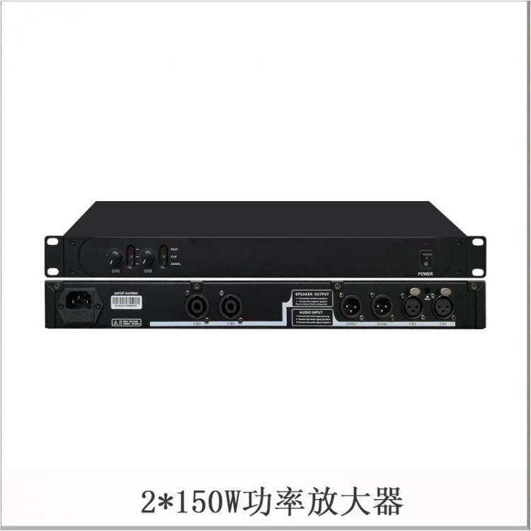 專業(yè)立體聲功放:8Ω額定功率(2*150W);頻率響應(yīng):20Hz-20KHz±0.5db ;諧波失真 < 0.08%;阻尼系數(shù): >450 ;電壓增益:34db ;信噪比:≥105DB ;聲道分離度≥65DB,電力消耗:500W;外型尺寸:483×430×44MM;毛重:5.2KG。