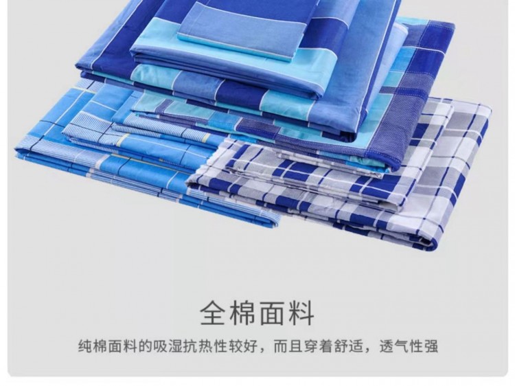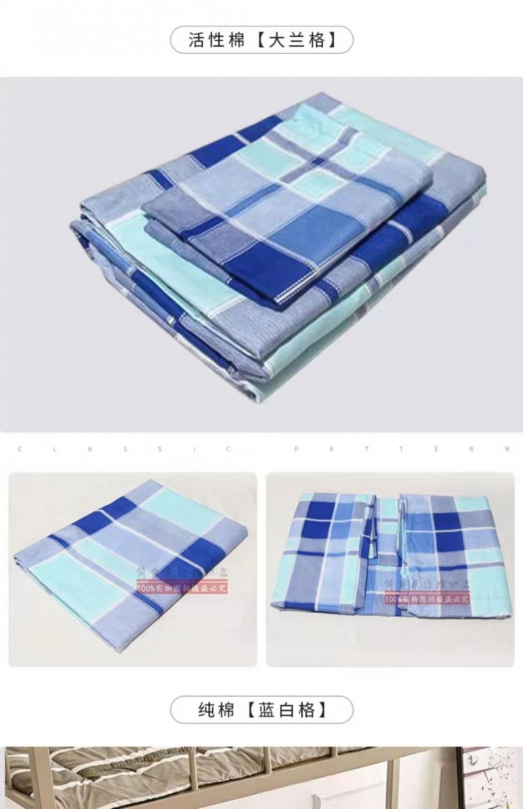 首頁(yè) > 供應(yīng)產(chǎn)品 > 成都本地家紡 物業(yè)公司學(xué)生上下鋪三件套單位宿舍藍(lán)色格子純棉被套罩條紋床單枕頭套