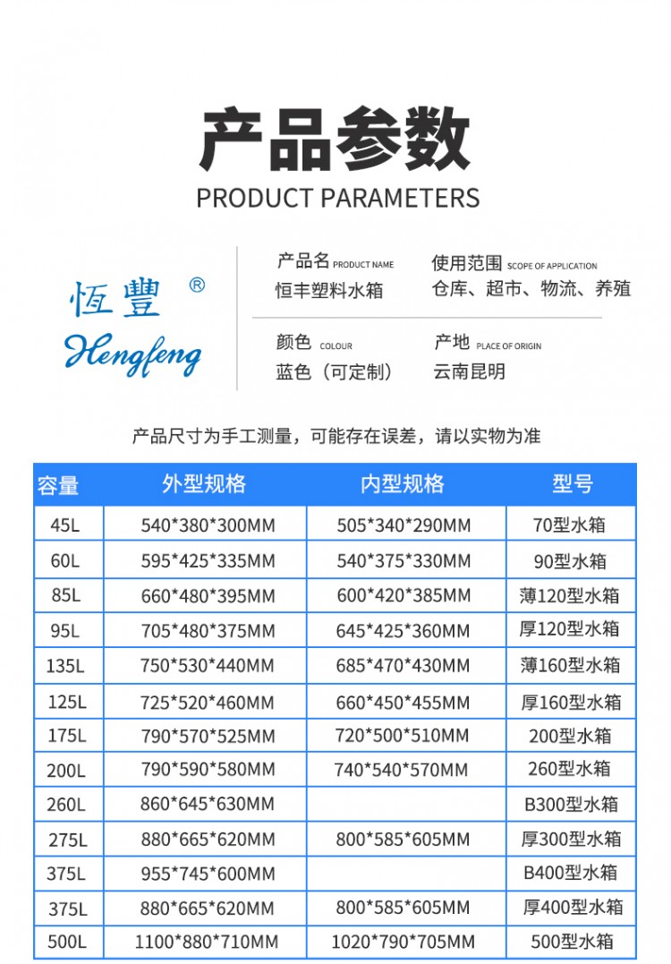 產(chǎn)品參數(shù) 產(chǎn)品名稱(chēng): HENGFENG/恒豐 塑料水箱 加厚160型 外尺寸725×530×460mm 內(nèi)尺寸660×450×455mm 白色藍(lán)色紅色廠家批發(fā)養(yǎng)魚(yú)水箱