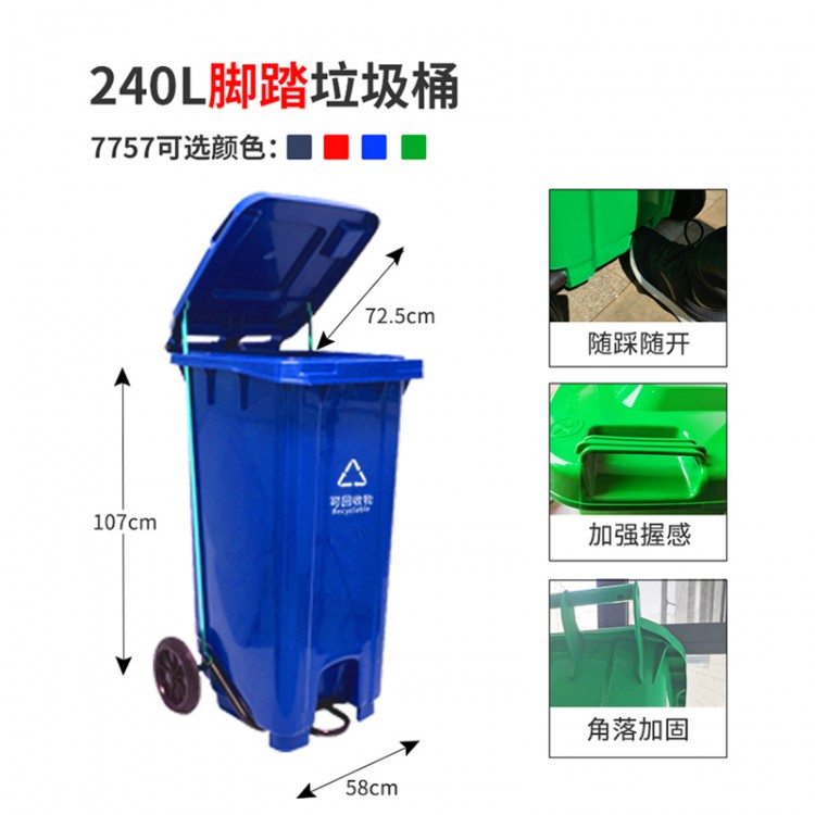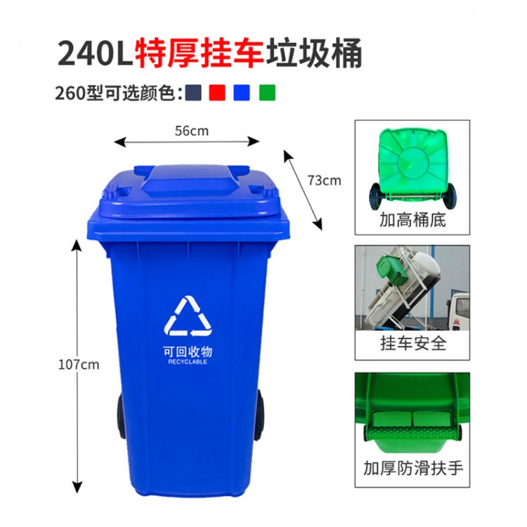 產(chǎn)品參數(shù) 產(chǎn)品名稱: 恒豐牌 240L 藍(lán)色 加厚240型環(huán)衛(wèi)垃圾桶 室外大號(hào)帶輪帶蓋戶外塑料垃圾桶 物業(yè)小區(qū)酒店餐廚果皮箱可定制