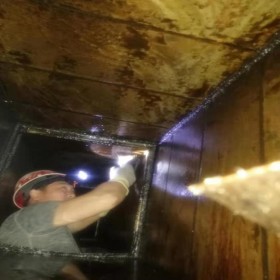 2,排煙橫管道清洗:工人由排煙罩口鉆到管道里面,用鏟刀將油垢鏟除,清洗完后管道內(nèi)壁90%以上無塊狀油垢.