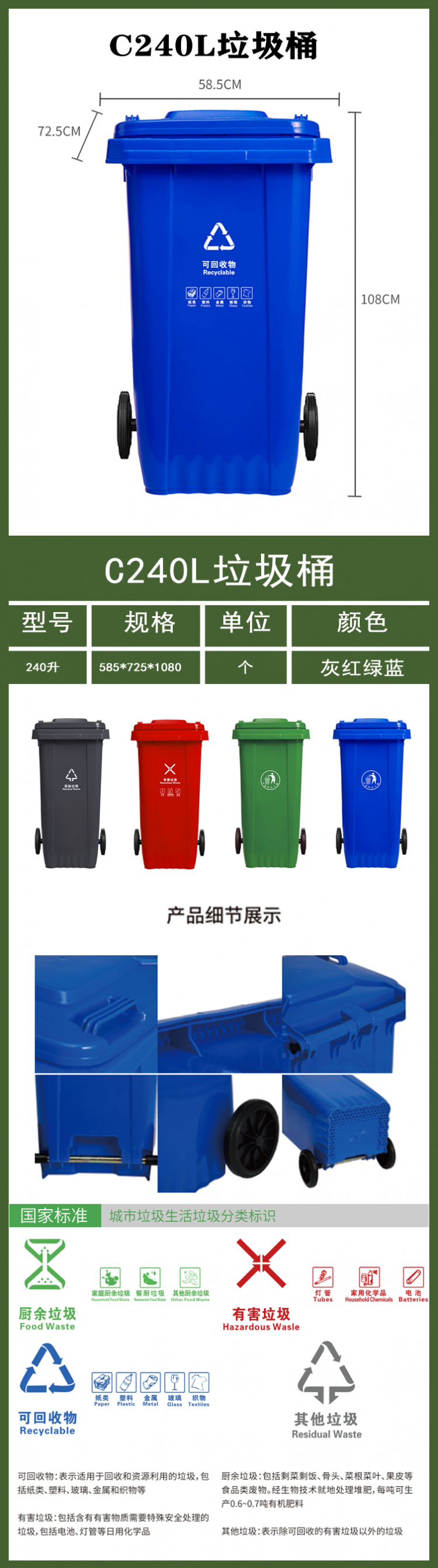 成都掛車?yán)皬S家 戶外垃圾桶批發(fā)廠家 戶外垃圾桶廠家外觀質(zhì)量好 C 240L 詳細信息 新國家分類垃圾桶 堅固耐用 色彩鮮艷 現(xiàn)貨供應(yīng) 送貨上門 免費開票