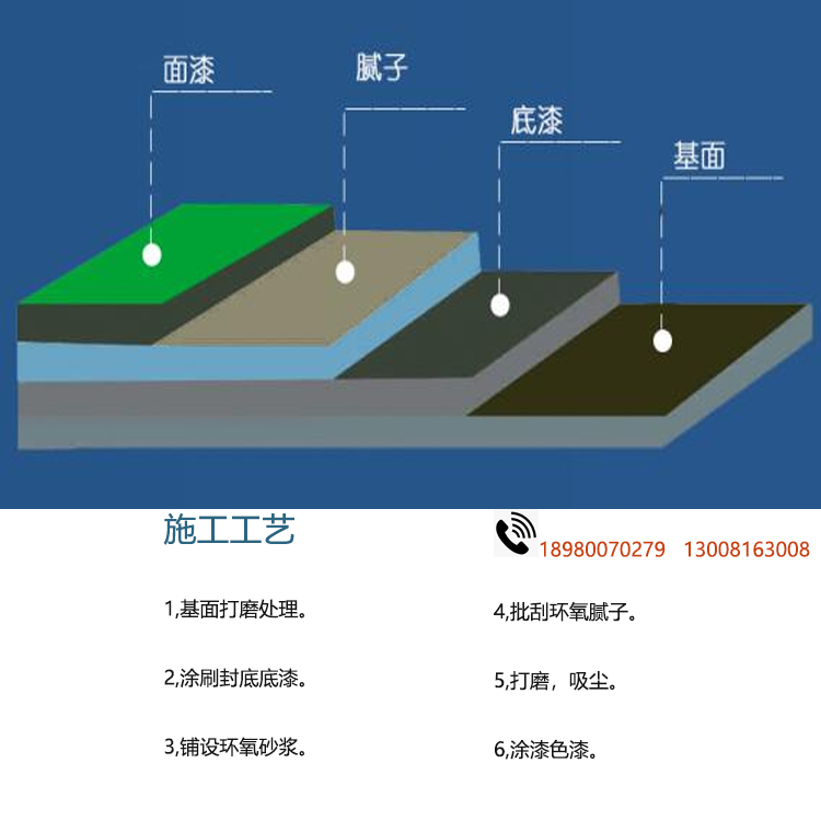 2, 環(huán)氧透明底漆,采用滲透性及附著力特強(qiáng)的環(huán)氧透明徹底漆滾涂一道。