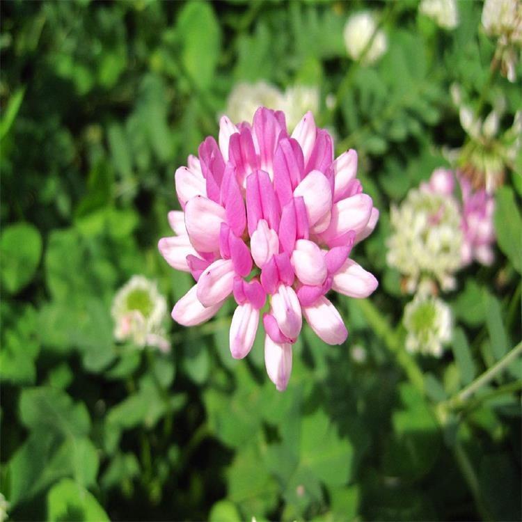 詳細信息  小冠花(學名:Securigera varia (L.) Lassenn)是豆科小冠花屬多年生草本植物,莖直立,粗壯,多分枝,疏展,高可達100厘米。髓心白色,奇數(shù)羽狀復葉,托葉小,膜質,披針形,葉柄短,小葉片薄紙質,橢圓形或長圓形,兩面無毛;小脈不明顯;小托葉小;小葉柄無毛;傘形花序腋生,花密集排列成繡球狀,苞片披針形,宿存;花梗短;花萼膜質,萼齒短于萼管;花冠紫色、淡紅色或白色,旗瓣近圓形,翼瓣近長圓形;龍骨瓣先端成喙狀,喙紫黑色,莢果細長圓柱形,各莢節(jié)有種;種子長圓狀倒卵形,6-7月開花,8-9月結果。