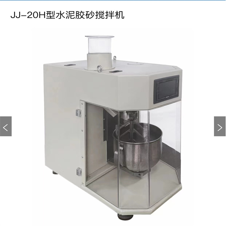 4、立即開動機器,低速攪拌30S后,在二個30S開始的同時均勻的將砂子加入,機器轉(zhuǎn)至高速30S,停拌90S,在一個15S內(nèi)用一膠皮刮具將葉片和鍋壁上的膠砂刮入鍋中間,在高速下繼續(xù)攪拌60S后停機,制備試件。