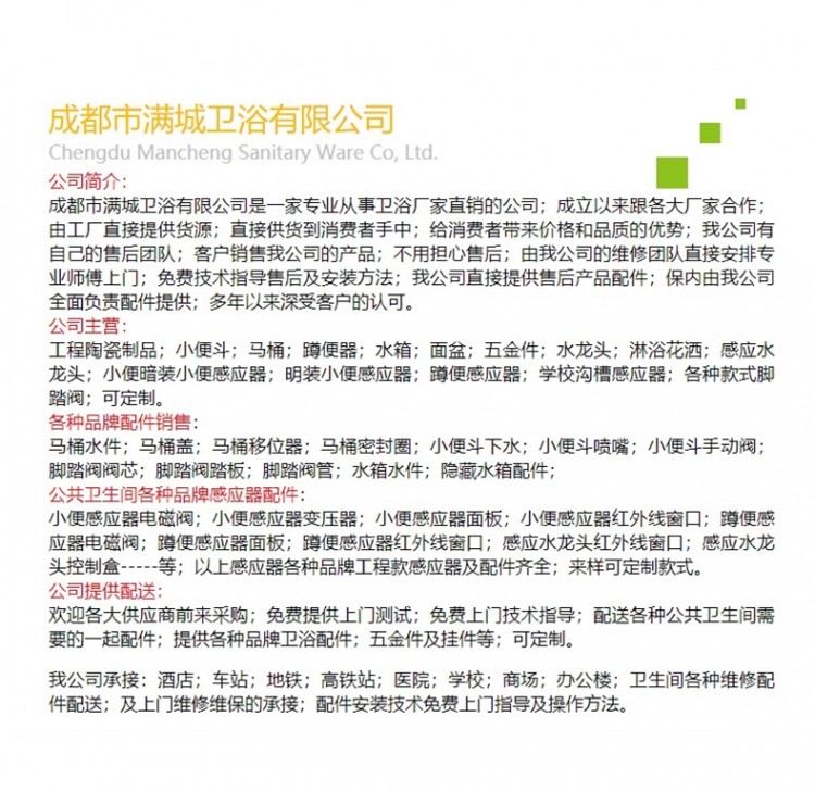 成都市滿城衛(wèi)浴有限公司是一家專業(yè)從事衛(wèi)浴廠家直銷的公司;成立以來跟各大廠家合作;由工廠直接提供貨源;直接供貨到消費者手中;給消費者帶來價格和品質(zhì)的優(yōu)勢;我公司有自己的售后團(tuán)隊;客戶銷售我公司的產(chǎn)品;不用擔(dān)心售后;由我公司的維修團(tuán)隊直接安排專業(yè)師傅上門;免費技術(shù)指導(dǎo)售后及安裝方法;我公司直接提供售后產(chǎn)品配件;保內(nèi)由我公司負(fù)責(zé)配件提供;多年以來深受客戶的認(rèn)可。