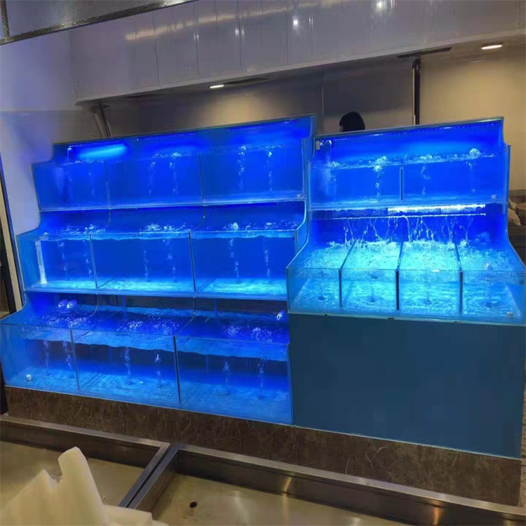 2.開放式魚缸:這也是非常常見的一種,也很實(shí)用,可以分成很多區(qū)域,不一樣的海鮮可以放在不同的地方,比較適合不同品種的寄養(yǎng)以及展示,像生鮮超市大多用這種,一些海鮮餐廳也可以用哦。同樣也要保證海鮮魚缸整體的干凈以及衛(wèi)生問題。