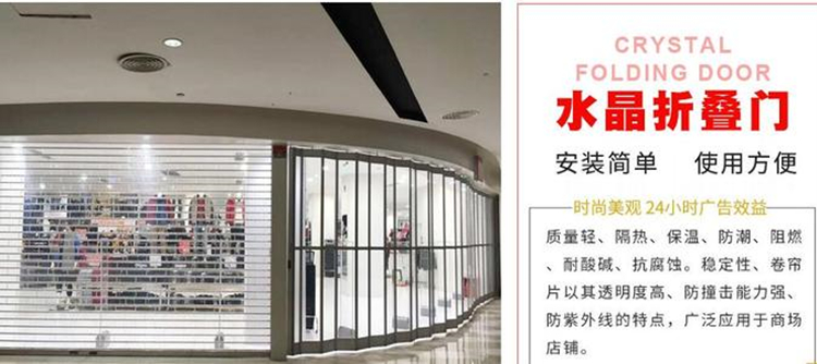 水晶卷簾門由PC水晶片、不銹鋼芯軸、底梁、消聲導槽、卷軸、卷簾門電機、遙控器等部件組成,門體標準化程度高,組裝方便,堅韌耐用,外形新穎別致,美觀大方,集實用性與觀賞性于一體,融格柵卷簾門與地彈簧玻璃門于一體。