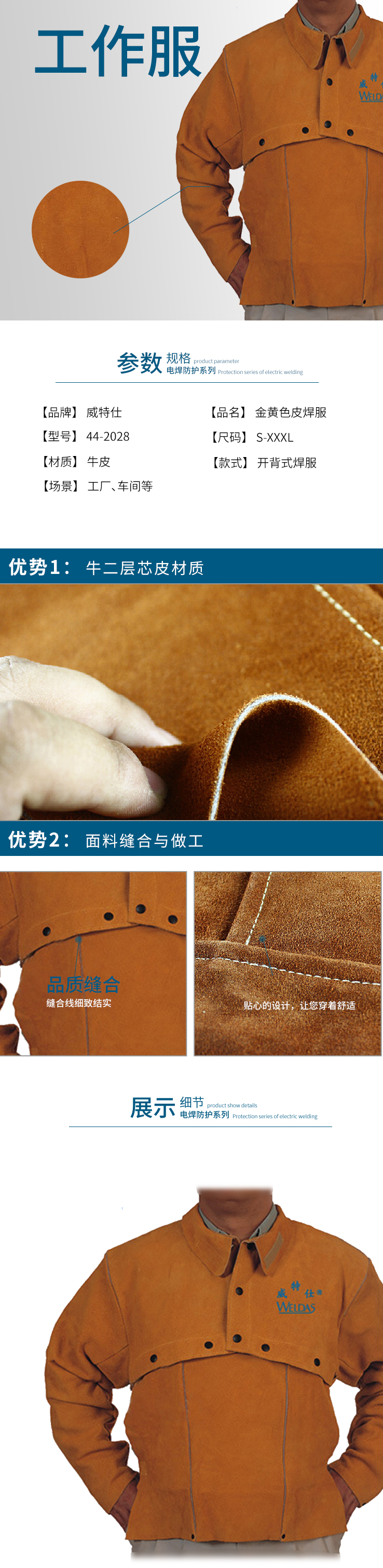 產(chǎn)品名稱:威特仕44-2028電焊防護(hù)衣焊接服牛皮隔熱防火防飛濺電焊工作服