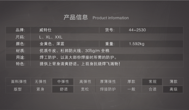 產(chǎn)品名稱:威特仕44-2530雄蜂王電焊服皮衣工作服焊接燒焊焊工服勞保服