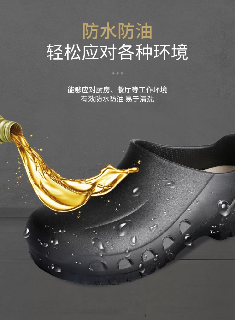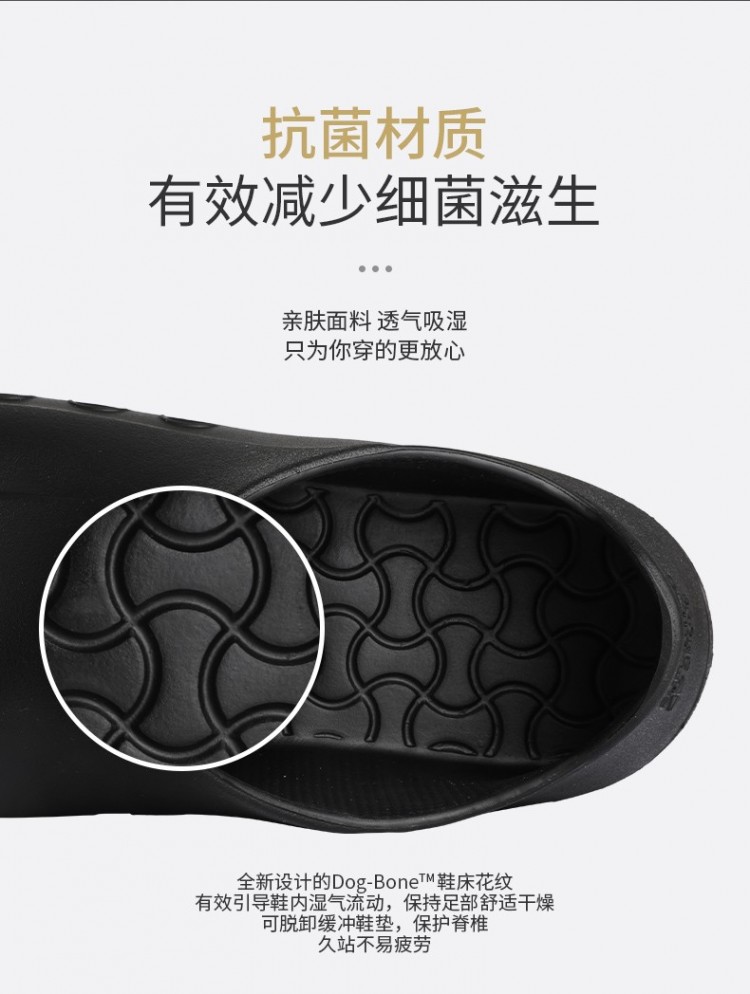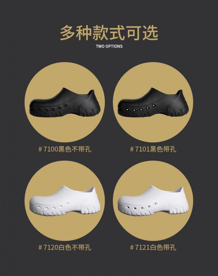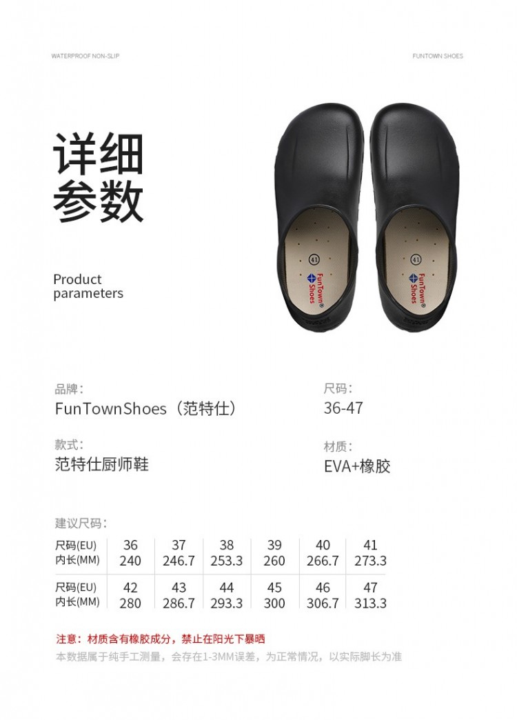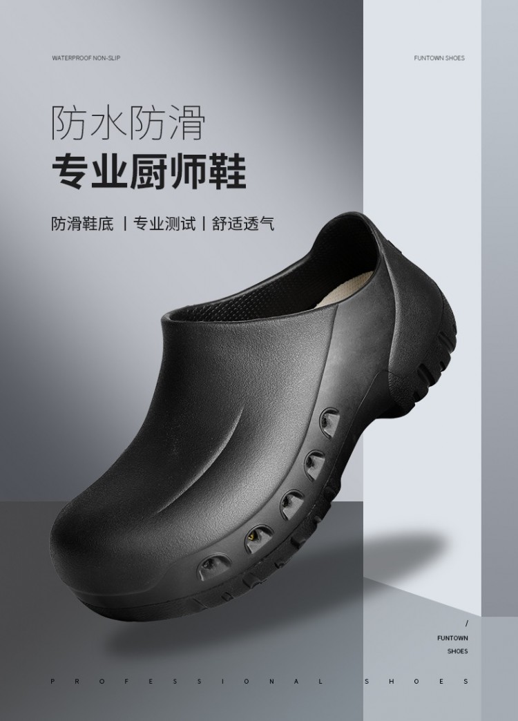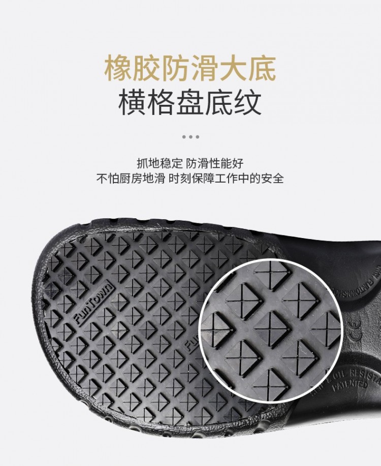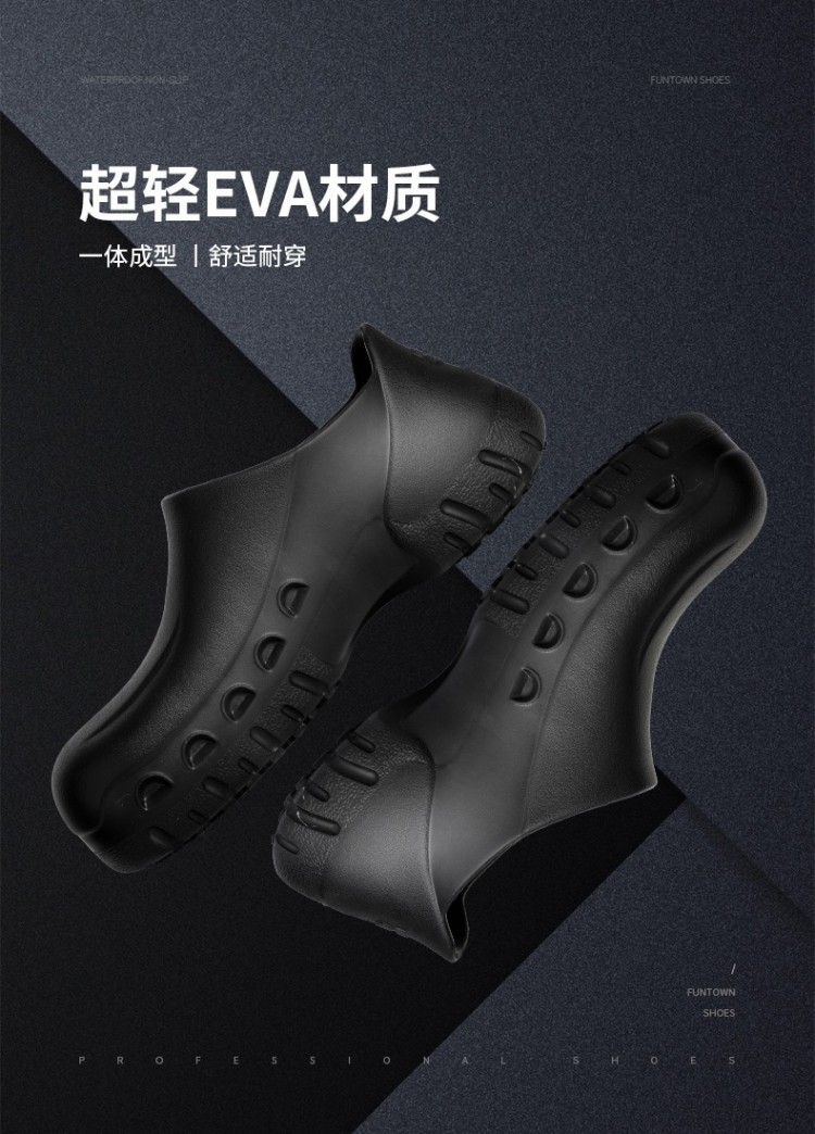 產(chǎn)品名稱:funtownshoes/范特仕 7100 黑色不帶孔 防滑橡膠大底廚師鞋 可水洗 EVA/塑膠材質(zhì)