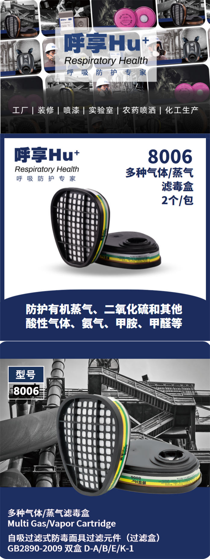 產(chǎn)品名稱:呼享8006多種氣體/蒸氣濾毒盒面具配件功能工業(yè)防護
