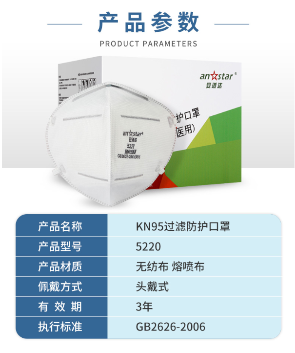 產(chǎn)品參數(shù) 產(chǎn)品名稱(chēng):安適達(dá)5220KN95口罩 防霧霾防飛沫帶海綿條鼻夾條頭戴式自吸過(guò)濾式防顆粒物可折疊口罩