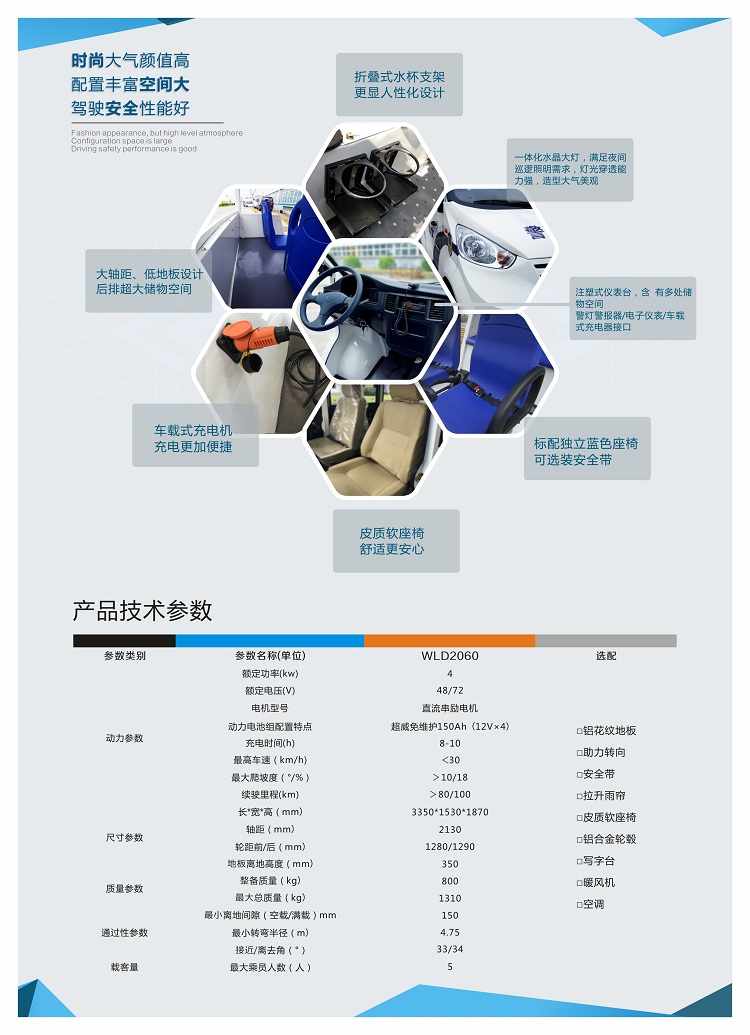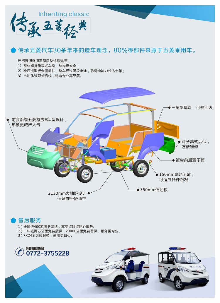 五菱M100燃油觀光車 凝聚了五菱30余年汽車制造技術(shù)、經(jīng)驗,設(shè)計質(zhì)量與產(chǎn)品制造質(zhì)量行業(yè)領(lǐng)先,80%零部件來源于五菱乘用車。嚴格按照乘用車制造及檢驗標準,整體焊接承載式車身,結(jié)構(gòu)更安全,沖壓成形鈑金覆蓋件,整車經(jīng)過陰極電泳,防腐能力長達十年。自動化裝配檢測線,鑄造專業(yè)高品質(zhì)。涵蓋了從5做到11座的巡邏車車系列產(chǎn)品。采用自主研發(fā)、享有專利權(quán)的電子限速系統(tǒng),符合國際GB/T21268-214體系標準。整車質(zhì)量三包期為2年內(nèi)或2萬公里內(nèi),三個月或2000-2500公里時(以先到者為準),進行免費強制首保。