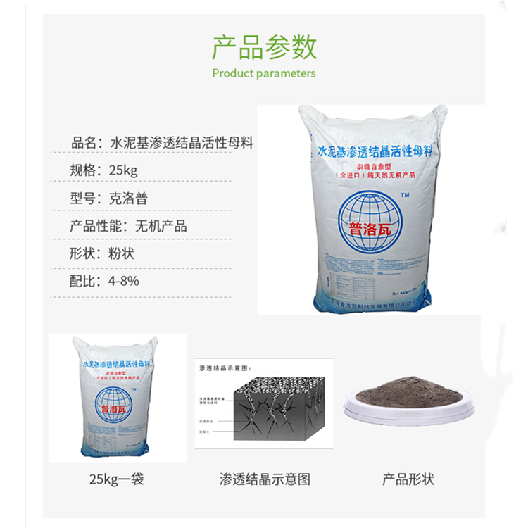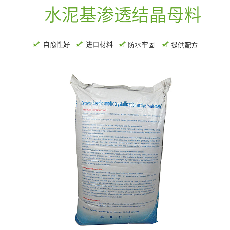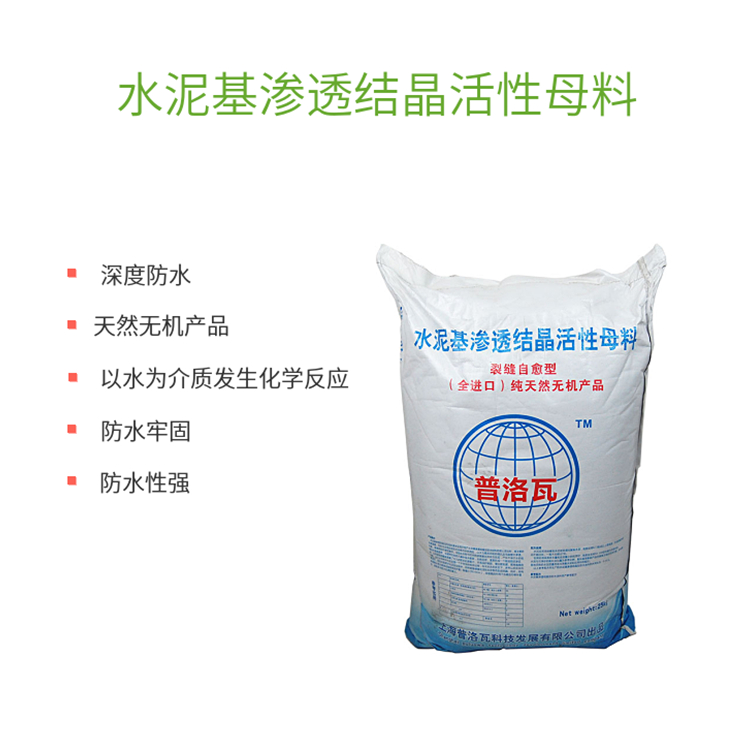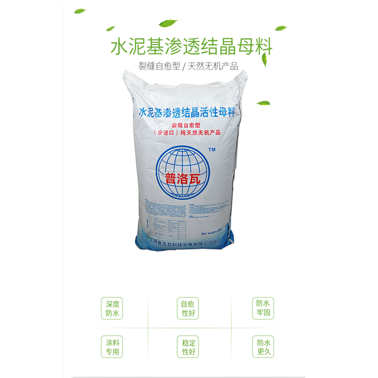 水泥基滲透結(jié)晶活性母料是一種具有特殊活性的物質(zhì),通過(guò)水為載體,隨著水對(duì)混凝土結(jié)構(gòu)孔隙進(jìn)行的滲透,活性母料成分被帶進(jìn)砼結(jié)構(gòu)的內(nèi)部孔縫中,其活性化合物能在混凝土內(nèi)部進(jìn)行傳輸、膨脹、產(chǎn)生物化反應(yīng),形成不溶于水的枝蔓狀結(jié)晶物,而使混凝土結(jié)構(gòu)得到充盈密實(shí),發(fā)揮抗?jié)B防水作用。