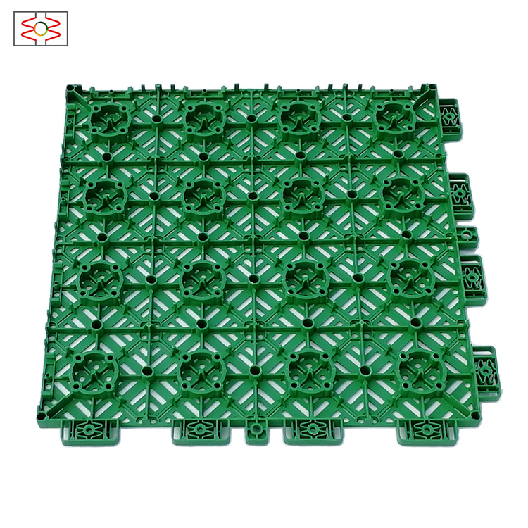 1、 室外運動地板表面為雪花紋落空面,耐沖擊性聚丙烯,多個密集支撐腳。模塊含有彈性鎖扣系統(tǒng),提供機械的水平緩沖性能;