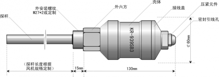 KR-939SB3型一體化三參數(shù)組合探頭為不銹鋼全封閉防水結(jié)構(gòu),重量約0.6kg ,探頭是以外螺紋形式,安裝于風(fēng)機(jī)減速箱的螺紋安裝孔中,探桿插入減速箱內(nèi),從而獲取減速箱中潤滑油溫度、潤滑油油位和箱體振動信號,完成變送輸出。螺紋規(guī)格和探桿插深需在定貨時(shí)申明。見[圖1]外型結(jié)構(gòu)示意圖。