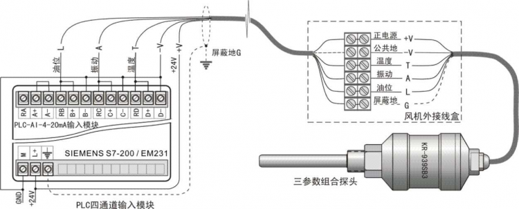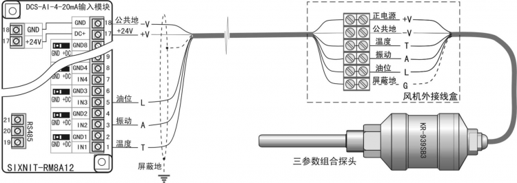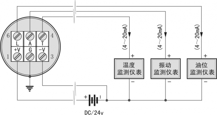 5線6端子連接: 1# +V:+24V電源; 2# G:與外殼連通可接屏蔽; 3# -V:公共地線; 4# T:溫度信號輸出; 5# A:振動信號輸出; 6# L:油位信號輸出。 典型接線參見[圖2]探頭接線原理示意圖。