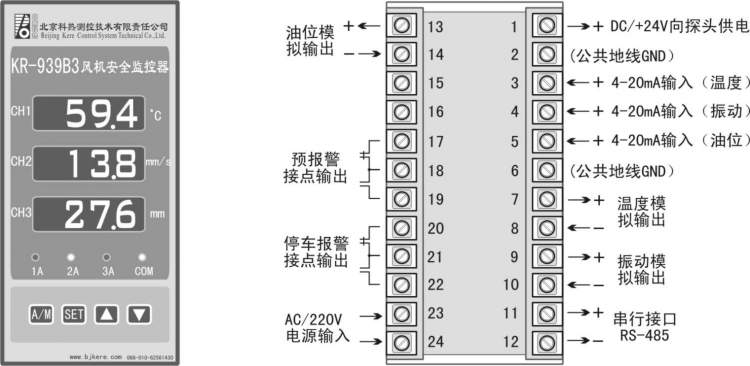 探頭可選配與KR-939B3型風(fēng)機(jī)安全監(jiān)控器連接使用,參見[圖3]KR-939B3面板示意圖,和[圖4]探頭與KR-939B3接線示意圖。
