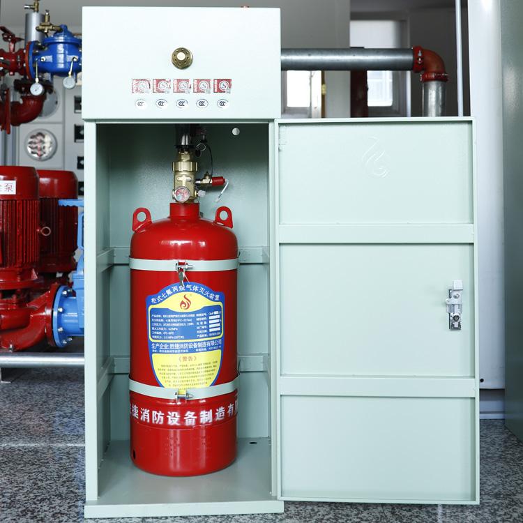 柜式七氟丙烷氣體滅火裝置包括:滅火劑瓶組、高壓軟管、電磁型驅(qū)動裝置、信號反饋裝置、噴嘴、柜體、七氟丙烷滅火劑組成。