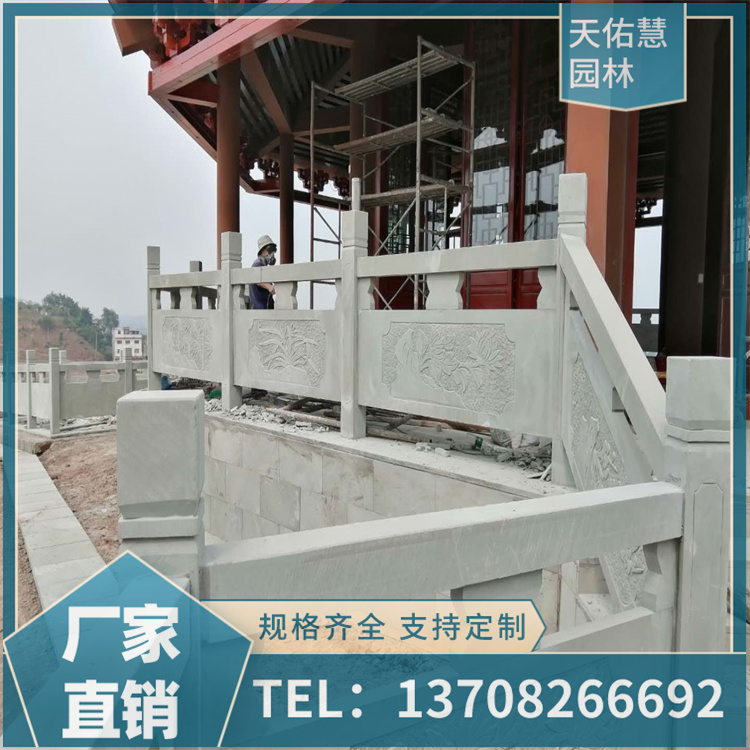 青石欄桿是由外形美觀的立柱和鑲嵌圖案按一定間隔(距離)排成柵欄狀的構(gòu)筑物。在園林環(huán)境中起到安全防護(hù)、隔離和裝飾美化、隔窨的作用。其圖案也有裝飾意義,因此處理好隔離和美化的關(guān)系,是欄桿設(shè)計(jì)成功的關(guān)鍵。