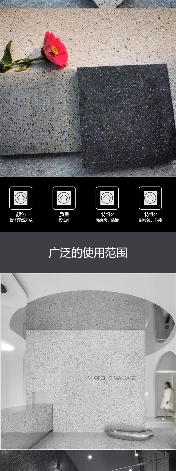磨石地板磚擁有很好的光澤度和較強(qiáng)的硬度,在使用過程中不容易受到外力的影響而產(chǎn)生變形或開裂的問題,具有很好的承重性能,因此可被廣泛應(yīng)用于各類裝修建筑物之中。鋪設(shè)了水磨石地板磚的地面具有很好的防滑性、防塵性、防火性以及環(huán)保性能,在使用過程中不容易發(fā)生人體摔倒和打滑等現(xiàn)象,讓裝修者能夠更加放心的使用這類材料。水磨石地板磚擁有很好的裝飾性能,在鋪設(shè)過程中,可通過對(duì)不同花色的水磨石地板磚進(jìn)行拼接或者是使用不同顏色的地板磚,提高室內(nèi)裝修的美觀性,從而為居住者打造不一樣的家居生活環(huán)境。