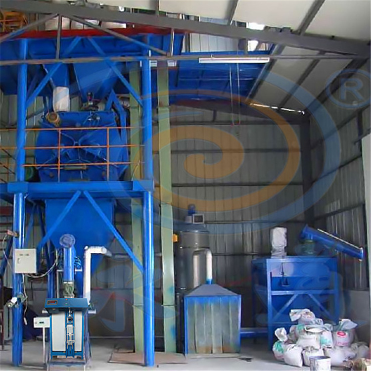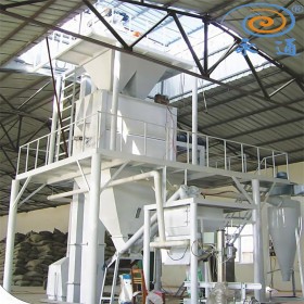 中型成套膩?zhàn)臃墼O(shè)備組成:無重力混合機(jī)-斗式提升機(jī)-成品倉(cāng)-待混倉(cāng)-自動(dòng)計(jì)量包裝機(jī)-鋼構(gòu)平臺(tái)組成