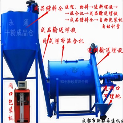 小型膩?zhàn)臃凵a(chǎn)線組成:臥式螺帶攪拌機(jī)-螺旋輸送機(jī)-成品倉(cāng)-自動(dòng)計(jì)量包裝機(jī)組成