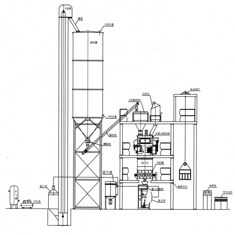 產(chǎn)品介紹: 大型干粉砂漿生產(chǎn)線: 主要是由原料儲存罐、螺旋輸送機、配料秤、斗提機、預(yù)混倉、小料倉、混合機、成品倉、包裝機、除塵系統(tǒng)、二次混合機(勻料器)。鋼架平臺??刂葡到y(tǒng)組成。水泥、灰鈣等大比例原料通過螺旋輸送至配料秤自動計量,利用斗提機提升至預(yù)混倉,使用預(yù)混倉可使整體設(shè)備起到流水線的作用,無需停機加料,母料通過自動計量(小料倉)自動完成添加,經(jīng)混合后由包裝機包裝再由輸送機輸送。這套生產(chǎn)線和簡易型/基本型相比不但具備了大料(水泥/粉煤灰)自動進料功能而且在儲罐上面安裝了料位自動報警裝置,具有自動送料、自動配料(大料)、自動包裝等特點。此設(shè)備投資高,一般產(chǎn)量可達50-200噸每天。操作工人5-8名、設(shè)備高度20-25米之間、設(shè)備占地面積200-300平方左右。
