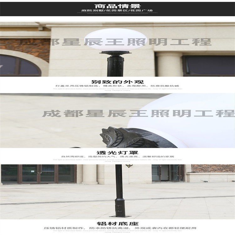 詳細信息 庭院燈主要應(yīng)用于城市慢車道、窄車道、居民小區(qū)、旅游景區(qū),公園、廣場等公共場所的室外照明,能夠延長人們的戶外活動的時間,提高財產(chǎn)的安全。庭院燈主要分為歐式庭院燈、現(xiàn)代庭院燈、古典庭院燈三大類。因其主要為觀賞景觀照明,所以燈頭多采用燈籠的形式出現(xiàn),外加高度多為2.5米、3米、3.5米以及4米,所以常配置的光源多為LED15W、20W或30W.