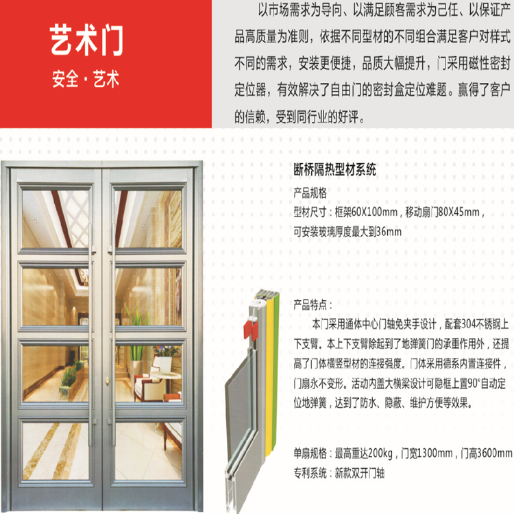 詳細(xì)信息 肯德基門具有:美觀大方、經(jīng)久耐用、顏色多樣、使用方便、開啟自如、保溫隔冷熱、降噪隔音、耐酸堿、耐腐蝕等化學(xué)穩(wěn)定性。易清洗,不易變色。安裝簡便快速, 使用壽命長,維修方便。已廣泛用于超市、商場、連鎖酒店、快餐店等區(qū)域的保溫,防沙、防塵、遮蔽隔離的應(yīng)用。