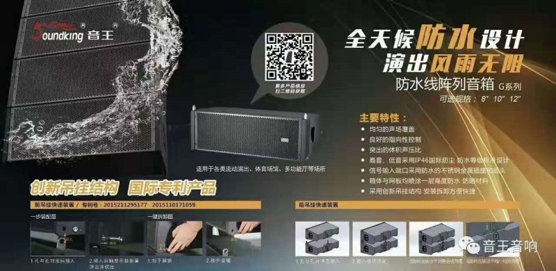G系列無源線陣音箱,每一款全頻音箱都完全符合線陣列原理。soundking歷經(jīng)多年研發(fā),研發(fā)出了線陣列音箱專用高頻波導(dǎo)號(hào)角、中頻相位塞、專利技術(shù)高中低音揚(yáng)聲器等核心部件。G系列無源線陣音箱良好的指向性控制,均勻的聲場(chǎng)覆蓋,突出的體積聲壓比等優(yōu)良品質(zhì),均得到業(yè)界的認(rèn)可。