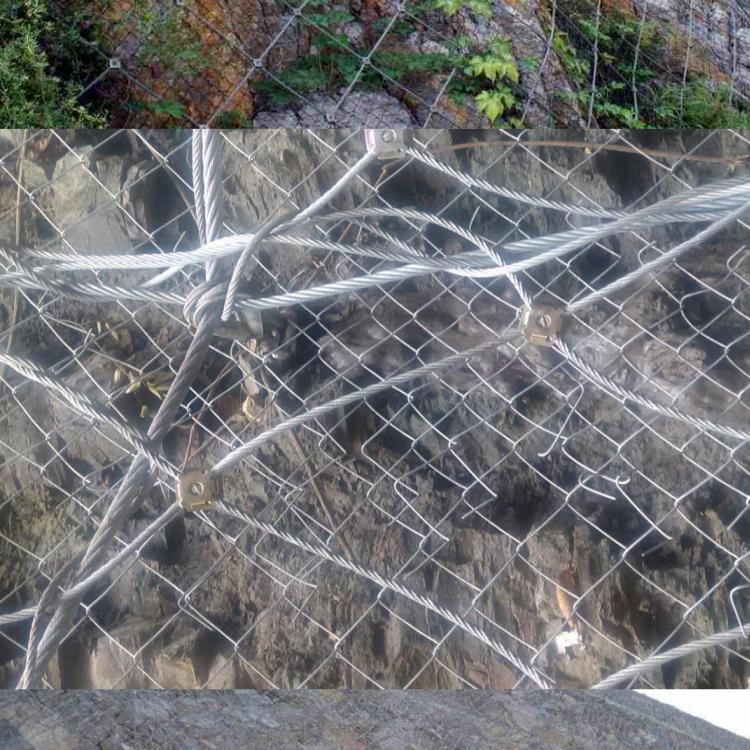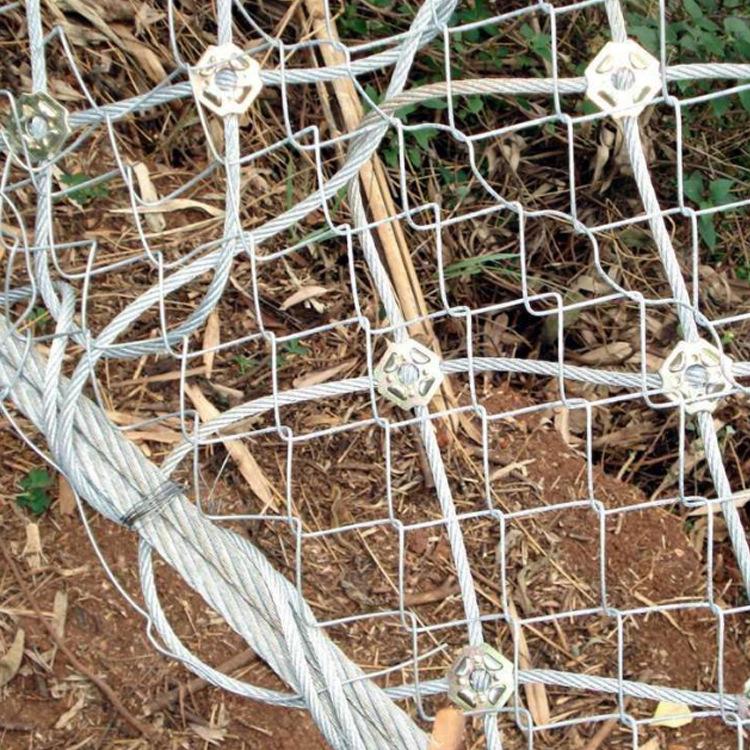 被動防護(hù)網(wǎng)由鋼絲繩網(wǎng)或環(huán)形網(wǎng)(需攔截小塊落石時附加一層鐵絲格柵),固定系統(tǒng)(錨桿、攔錨繩、基座和支撐繩)、減壓環(huán)和鋼柱四個主要部分構(gòu)成。鋼柱和鋼絲繩網(wǎng)連接組合構(gòu)成一個整體,對所防護(hù)的區(qū)域形成面防護(hù),從而阻止崩塌巖石土體的下墜,起到邊坡防護(hù)作用。