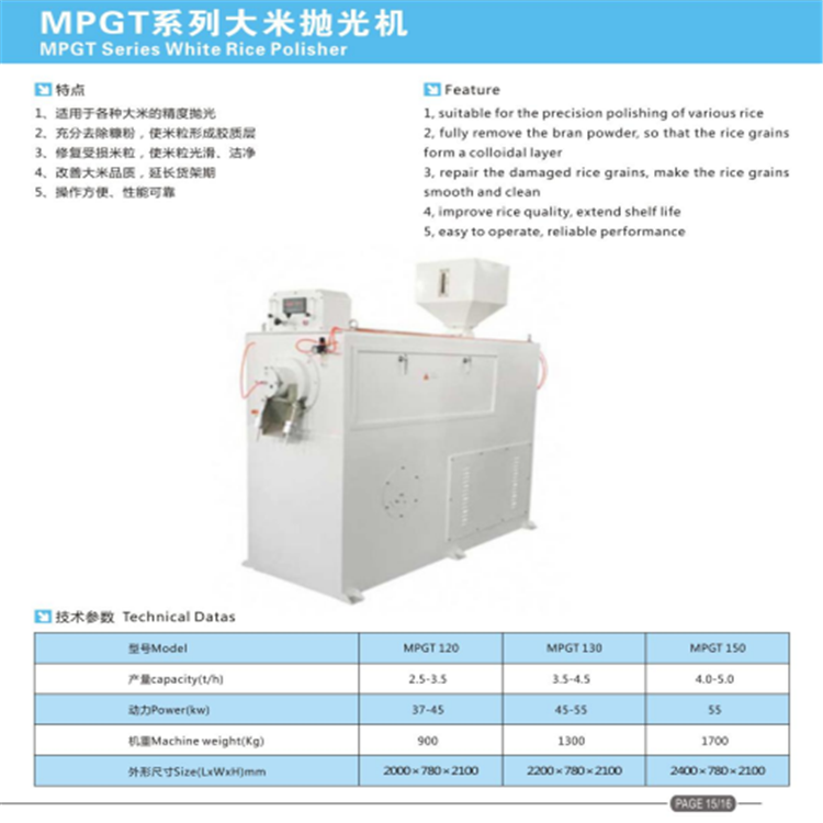 3.優(yōu)點(diǎn):清理去石機(jī)采用新改進(jìn)型,外形美觀,具有清理大雜,中雜,小雜全套功能。礱谷機(jī)采用先進(jìn)的剝殼原理,同步帶傳動(dòng), 無噪音不打滑,能保證運(yùn)轉(zhuǎn)的線速差,高剝殼率,產(chǎn)量高。重力谷糙分離篩操作簡(jiǎn)單,故障率低,篩面小但產(chǎn)量大。碾米機(jī)采用上下一-砂- -鐵的原理,減少了提升工藝,米溫低,碎米少,米質(zhì)光滑潔白。