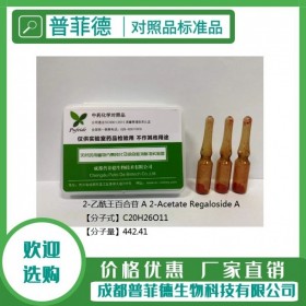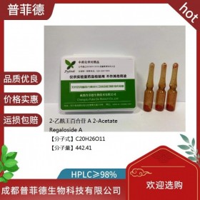 2-乙酰王百合苷 A 2-Acetate Regaloside A 【分子式】C20H26O11 【分子量】442.41 【用途】2-乙酰王百合苷 A (2-Acetate regaloside A) 對照品系供 百合(卷丹)配方顆粒特征圖譜與含量測定等項下用。 【特性量值】99.3%。 【使用方法】使用前不需干燥處理。 【包裝】棕色安瓿 【貯藏】2-8℃保存。