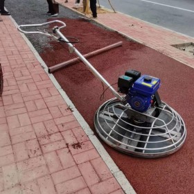 透水混凝土屬干性混凝土料,其初凝快,攤鋪必須及時。對于人行道面,大面積施工采用分倉方式進(jìn)行攤鋪,其松鋪系數(shù)為1.1。將混合物均勻攤鋪在工作面上,用刮尺找準(zhǔn)平整度和控制一定的泛水度,用抹刀抹平,抹合不能有明水。