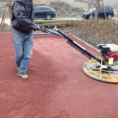 透水混凝土屬干性混凝土料,其初凝快,攤鋪必須及時。對于人行道面,大面積施工采用分倉方式進行攤鋪,其松鋪系數(shù)為1.1。將混合物均勻攤鋪在工作面上,用刮尺找準平整度和控制一定的泛水度,用抹刀抹平,抹合不能有明水。