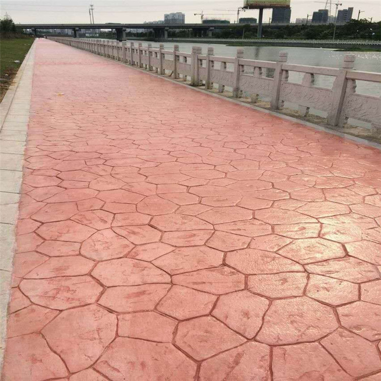 5、使用藝術(shù)地坪模具對地坪面層進(jìn)行紋理處理。藝術(shù)地坪模具應(yīng)配套使用,首先確定好紋理的分布方向,選好一塊模具放置的位置和角度,然后其它的模具依次緊貼一塊模具放置。彩色混凝土藝術(shù)地坪壓模采用壓模,壓模應(yīng)由技術(shù)較好的人員進(jìn)行作業(yè)以保證壓紋深度一致和模具放置的準(zhǔn)確性。