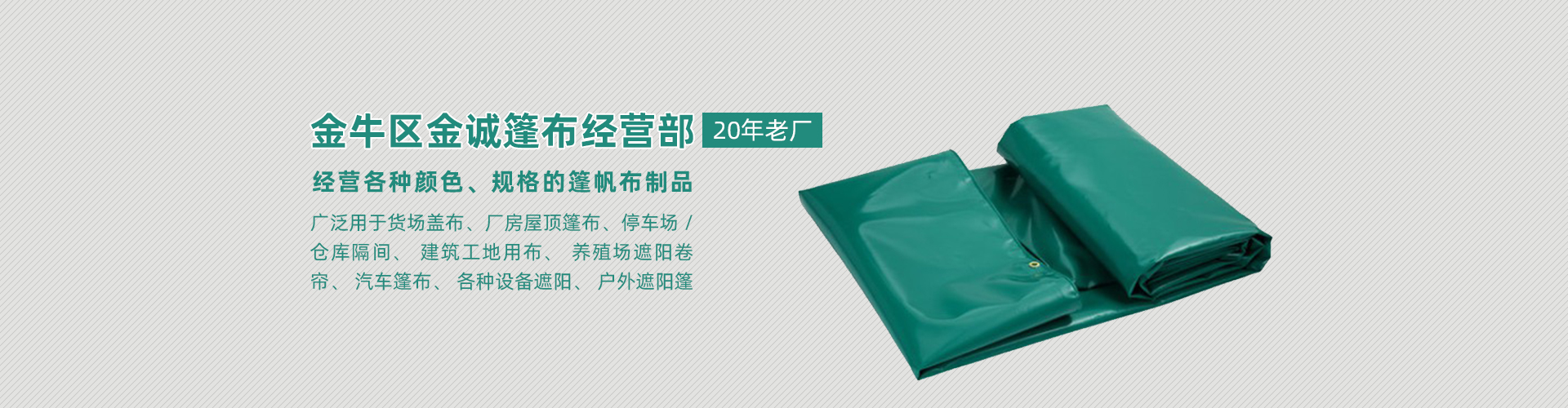 成都金誠篷布廠是有20年專業(yè)經(jīng)驗的防水篷布生產(chǎn)廠家,座落于美麗的天府之城-成都。公司生產(chǎn)經(jīng)營各種顏色、規(guī)格的篷帆布制品,可來樣加工定做各種規(guī)格尺寸成品篷布。主要產(chǎn)品有1*2、2*2、3*2、3*3等相關規(guī)格的篷布、帳篷布、涂塑布、三防布、風筒布等。具有防水、防火、防霉、耐寒、耐高溫、抗紫外線、抗老化等性能。產(chǎn)品廣泛用于貨場蓋布、廠房屋頂篷布、停車場/倉庫隔間、建筑工地用布、養(yǎng)殖場遮陽卷簾、汽車篷布、各種設備遮陽、戶外遮陽篷等。公司以品種齊全、質(zhì)量優(yōu)異、價格合理、工藝先進和優(yōu)質(zhì)的服務,贏得了廣大客戶的信任。期待與各地新老客戶真誠合作,攜手共贏! [詳細介紹]
