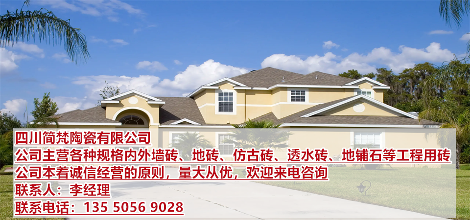 四川簡(jiǎn)梵陶瓷有限公司位于中國(guó)西部瓷都——夾江。公司是一家集瓷磚技術(shù)研發(fā)、專業(yè)生產(chǎn)和市場(chǎng)營(yíng)銷(xiāo)為一體的高端陶瓷生產(chǎn)企業(yè)。公司主營(yíng)產(chǎn)品有各種規(guī)格:廣場(chǎng)磚、生態(tài)地鋪石、陶瓷透水磚、石英磚、景觀石、PC磚、PC路沿石、小地磚、仿古磚、彩色藝術(shù)磚、電梯門(mén)套、防滑地磚、梯步磚、耐酸磚、人造文化石、燒結(jié)磚、天然大理石、花崗石、青磚、青瓦、西瓦、軟瓷外墻磚,巖板,價(jià)格合理,性價(jià)比高,質(zhì)量保證,廠家直銷(xiāo),量大從優(yōu),歡迎來(lái)電咨詢。 [詳細(xì)介紹]