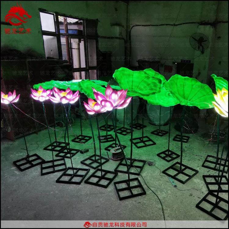 夜游燈具裝置定做公司發(fā)光荷花荷葉玻璃鋼雕塑樹脂彩燈模型定做公司