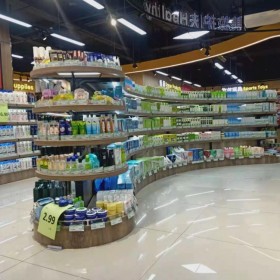 超市貨架雙面鋼木架 弧形中島展示架子 便利店展示貨架支持定制