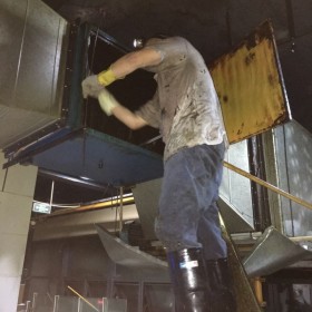 當煙道小于40公分見方時,無法進入時采用此法,技術人員根據(jù)現(xiàn)場實際情況,每隔一定距離拆卸一段煙道向兩方延伸清理,此法效果好,難度較大,費用較高。
