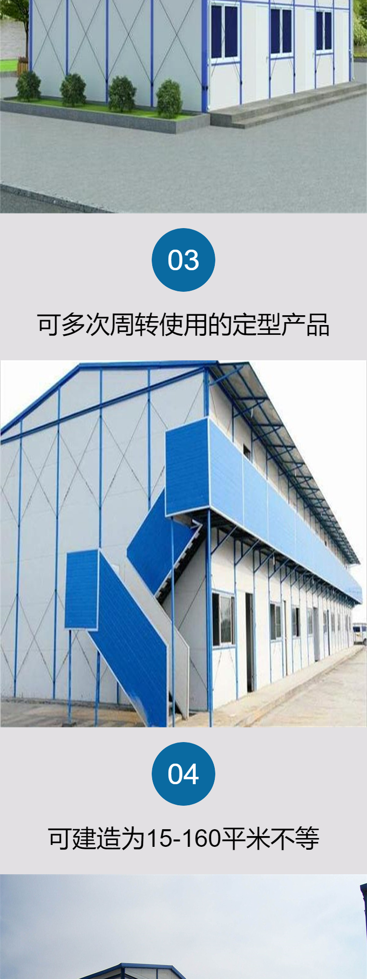 活動(dòng)板房是一種以彩鋼板為骨架,以?shī)A芯板為圍護(hù)材料,以標(biāo)準(zhǔn)模數(shù)系列進(jìn)行空間合,構(gòu)件采用螺栓連接,全新概念的環(huán)保經(jīng)濟(jì)型活動(dòng)板房屋。可方便快捷地進(jìn)行組裝和拆卸,實(shí)現(xiàn)了臨時(shí)建筑的通用標(biāo)準(zhǔn)化,樹立了環(huán)保節(jié)能、快捷高效的建筑理念,使臨時(shí)房屋進(jìn)入了一個(gè)系列化開發(fā)、集成化生產(chǎn)、配套化供應(yīng)、可庫(kù)存和可多次周轉(zhuǎn)使用的定型產(chǎn)品領(lǐng)域。