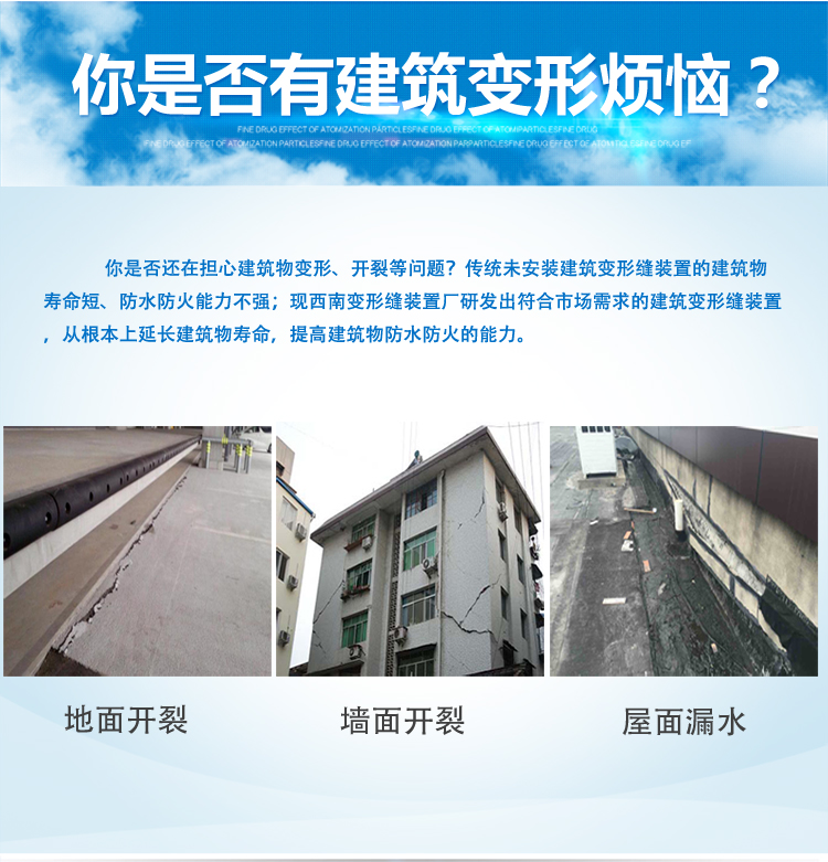 墻面變形縫:墻面變形縫作用和地面變形縫裝置一樣,主要用于建筑變形縫的伸縮,沉降,抗震等功能要求,同時(shí)起到裝飾作用,外墻建筑變形縫必須配裝防水材料。主要分為金屬蓋板型,金屬卡鎖型,橡膠嵌平行等三種。