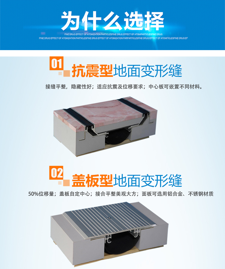 金屬卡鎖型地坪變形縫——由一塊自由移動(dòng)的中心板來(lái)實(shí)現(xiàn)變形,中心板壓緊在兩側(cè)鋁合金基架之間,在建筑物發(fā)生伸縮變形時(shí)能保持其水平狀態(tài)。產(chǎn)品表面加工成鋸齒形,防滑??射佋O(shè)薄型材料。