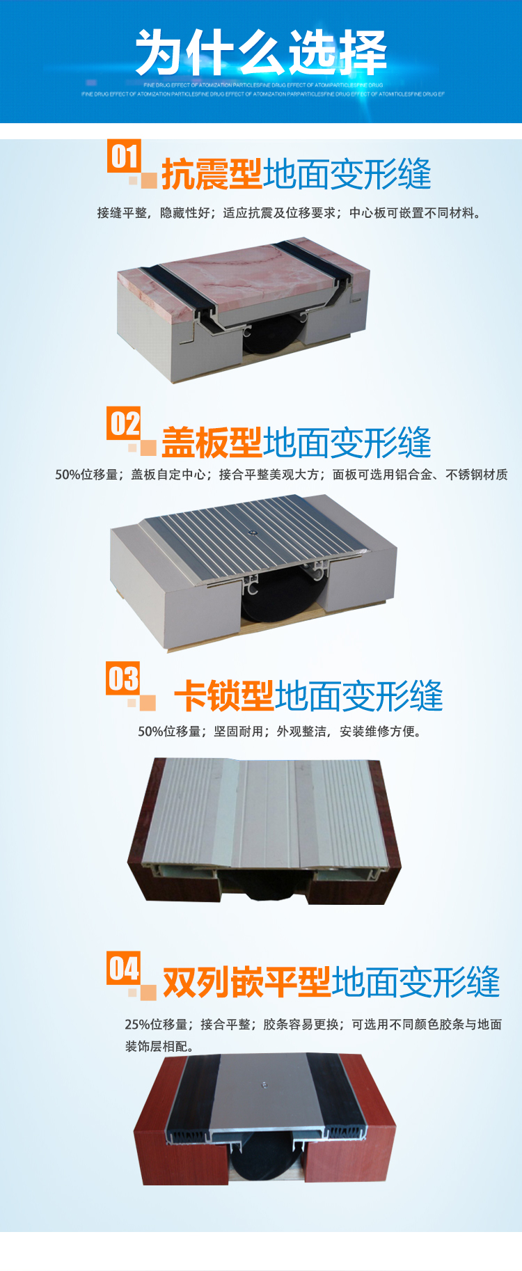 1:滿足于地面伸縮縫位置的遮蓋,起到裝飾作用。同時可滿足伸縮縫的伸縮位移量。當配置抗震彈簧的時候還可以滿足建筑抗震,沉降等運動要求。